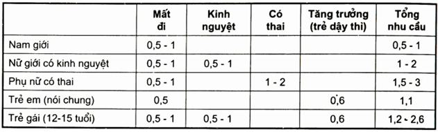 Bảng. Nhu cầu sắt hàng ngày của người (đơn vị mg/ngày)