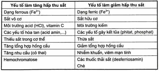 Bảng. Các yếu tố ảnh hưởng đến sự hấp thu sắt trong cơ thể
