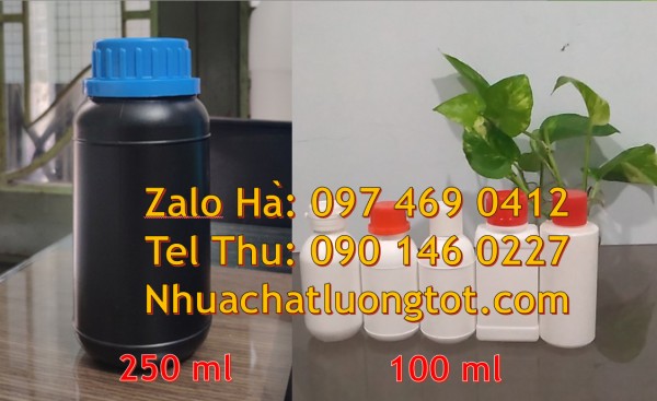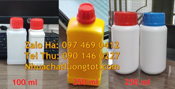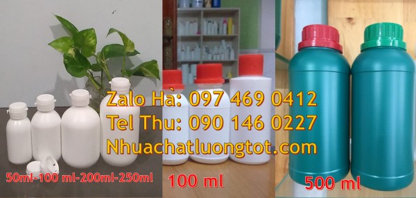 Chai nhựa 250 ml đựng axit. Chai nhựa 500 ml, bình nhựa 0.5 lít,chai 30ml nắp xé, bình nhựa 0.5 lít,chai 250 ml đựng thuốc rầy, chai 500ml màu trong,