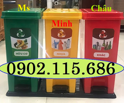 thùng rác 3 ngăn phân loại rác, thùng rác nhựa đạp chân 3 ngăn, thùng rác văn