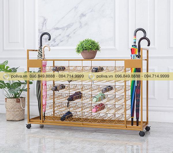 Thiết kế giá để dù khá đơn giản nhưng lại rất tiện lợi. Ngoài hệ thống các ô vuông dùng để cắm dù thì còn có thêm các móc hỗ trợ giúp treo ô gập một cách dễ dàng. Cách bày trí này giúp mẫu kệ có thể chứa được số lượng lớn ô dù 1 lần.