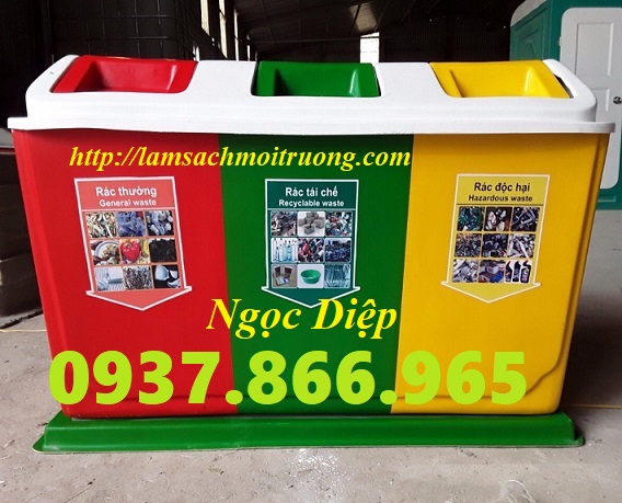 xanh lá, vàng, đỏ cho 3 loại : rác thường, rác tái chế, và rác độc hại