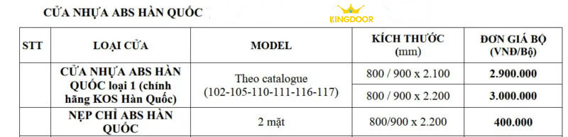 Bảng giá cửa nhựa ABS Hàn Quốc[/caption]| CỬA NHỰA ABS HÀN QUỐC KOS CỬA PHÒNG HOẶC VỆ SINH - Độ dày cánh 35mm (± 2). - Kết cấu cánh bằng nhựa ABS (loại nhựa đặc biệt có khả năng chịu va đập). - Khung bao bằng nhựa tổng hợp cao cấp bên trong gia cố lõi thép, khung 45 x 110 (± 2). Khung tối đa ôm tường 130mm - Bề mặt là DeCo-Sheet nhựa thông hoạt tính cho bề mặt như vân gỗ thật, không hút ẩm. | Bộ | 900x2200 (Phủ bì) | 3.000.000 | 1 | 3.000.000 |