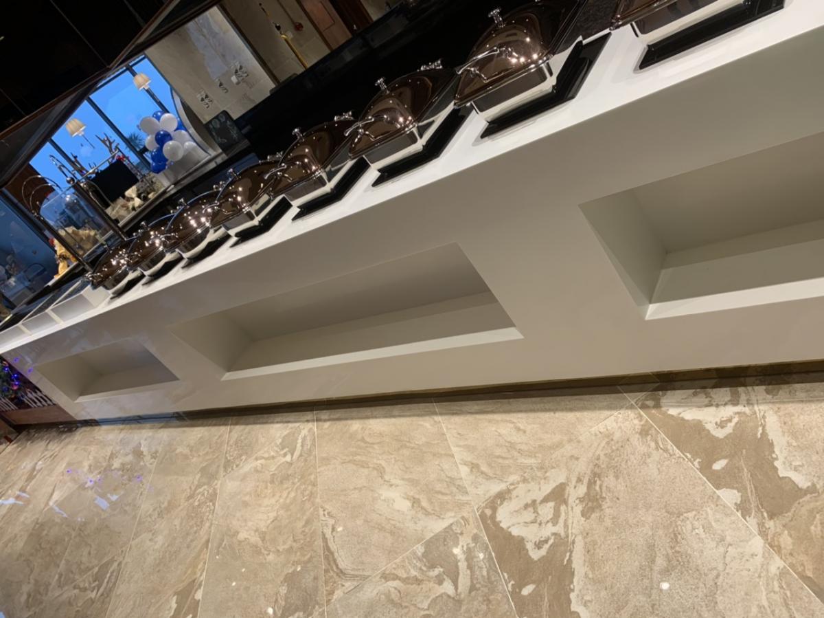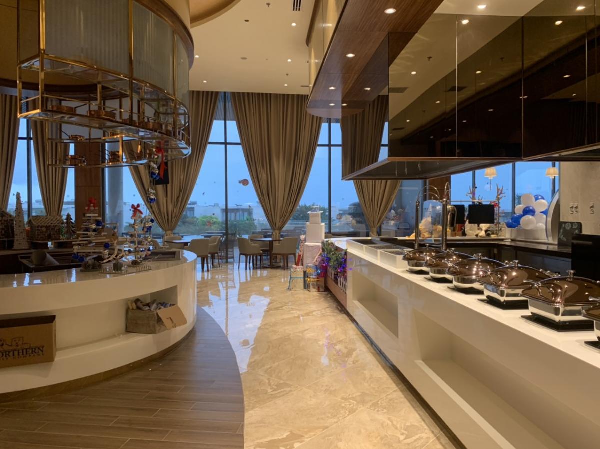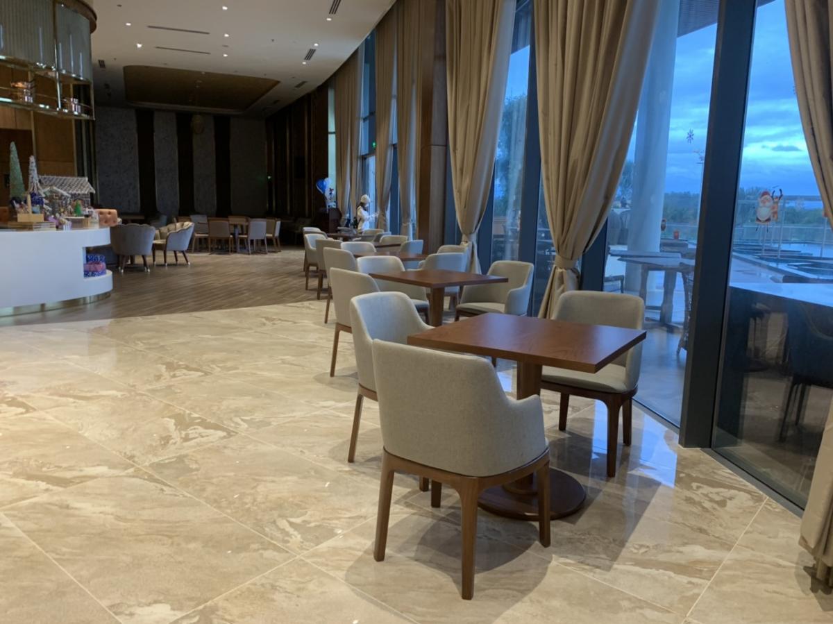 Sự kết hợp hoàn hảo giữa gạch giả đá và gạch vân gỗ lát nền nhà hàng mang đến cảm giác gần gũi cho khách hàng