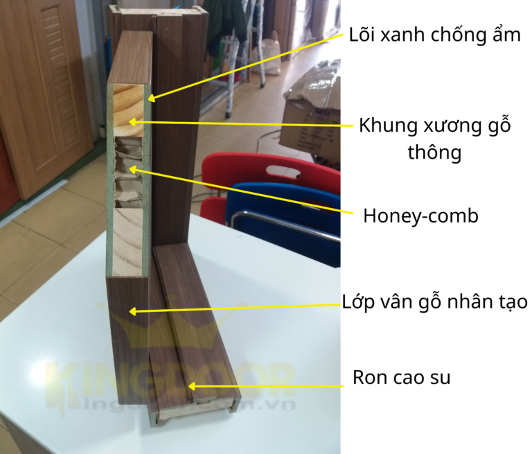 – Bên trong là khung xương bằng gỗ thông tự nhiên, đã được xử lý kỹ trong quá trình sản xuất. Tạo nên độ cứng chắc cho cánh cửa.