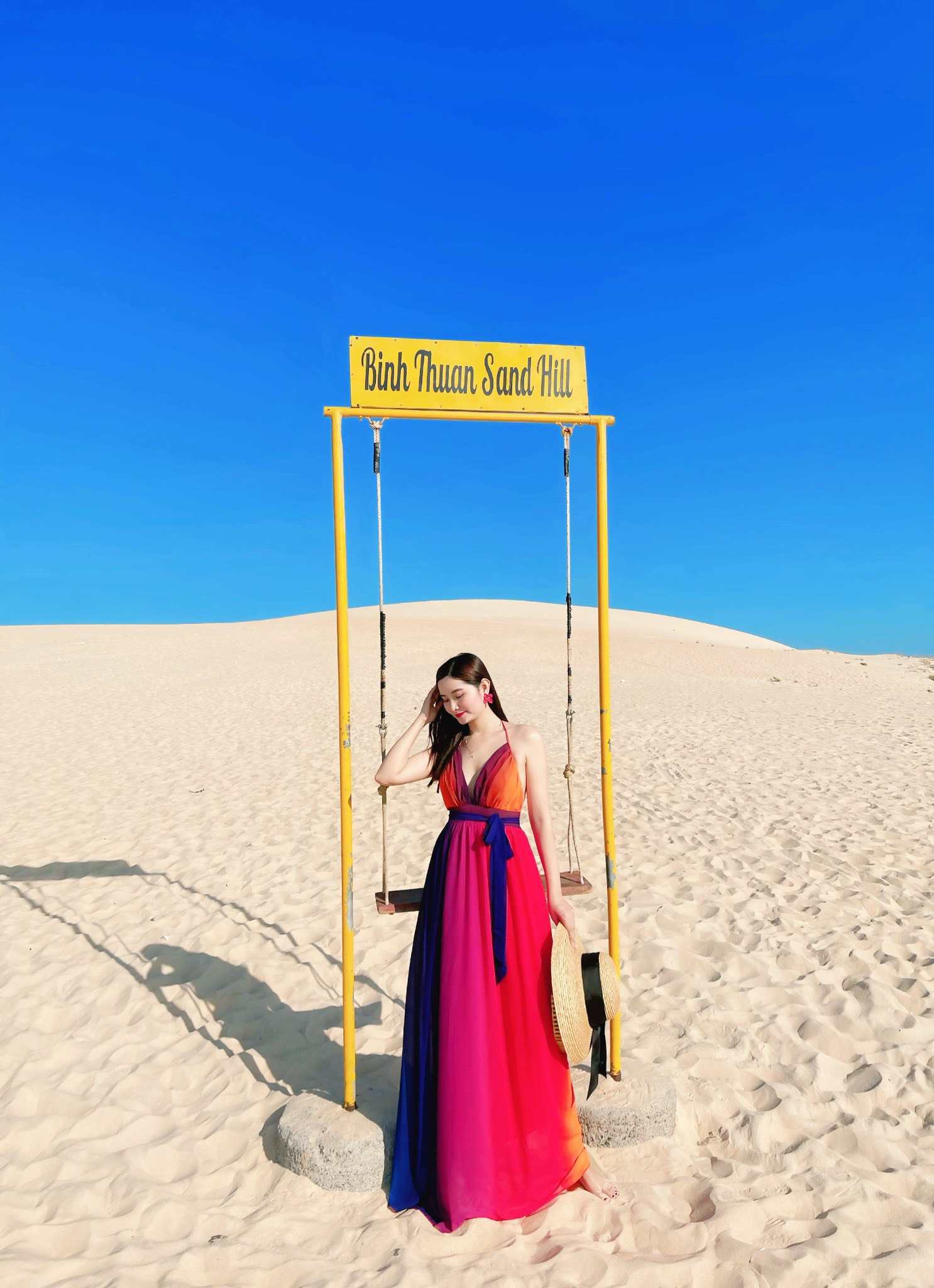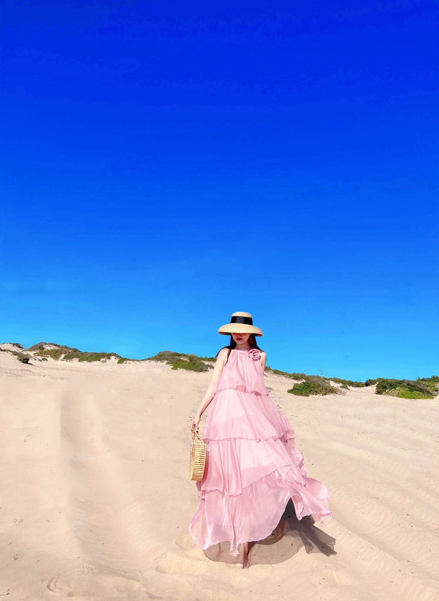 Một tư thế phổ biến khác đó là tạo dáng như đang bước đi để tóc và váy maxi dài đi biển của bạn được thả bay theo làn gió. Các nàng có thể phối thêm các phụ kiện như nón rộng vành, túi xách hoặc cầm giày trên tay để tấm ảnh được tự nhiên hơn.