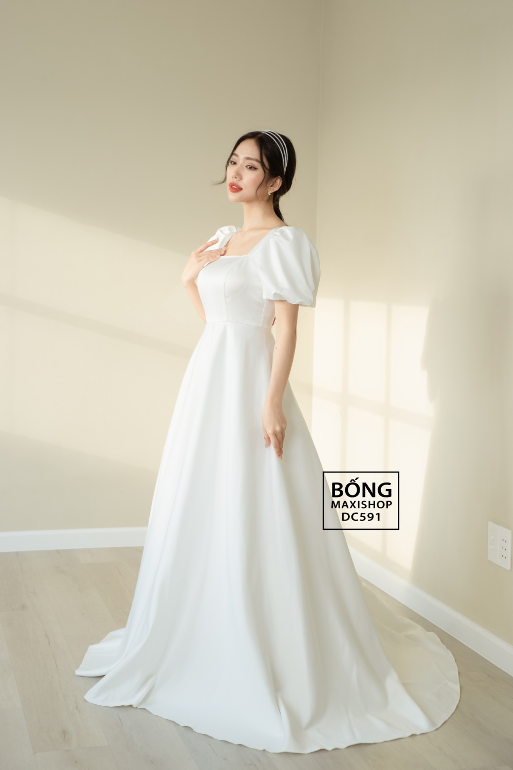 Mua ngay: Váy cưới lụa 2 da tay bí cổ vuông DC591